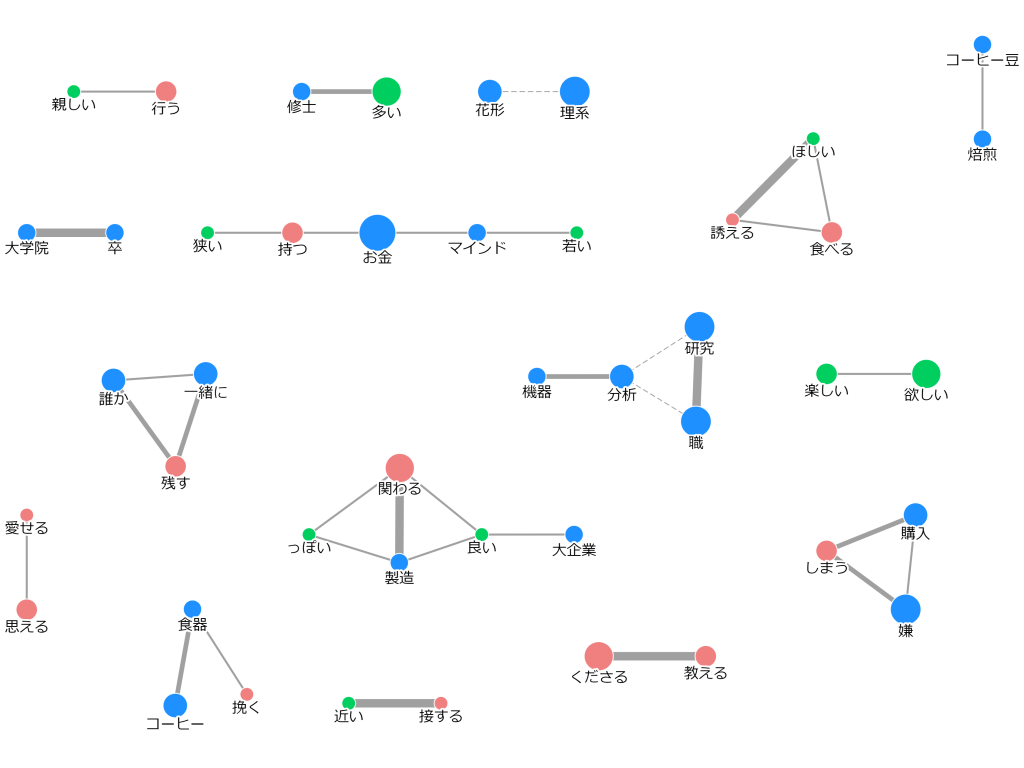 文章中に出現する単語の出現パターンが似たものを線で結んだ図です。出現数が多い単語ほど大きく、またの程度が強いほど太い線で描画されます。